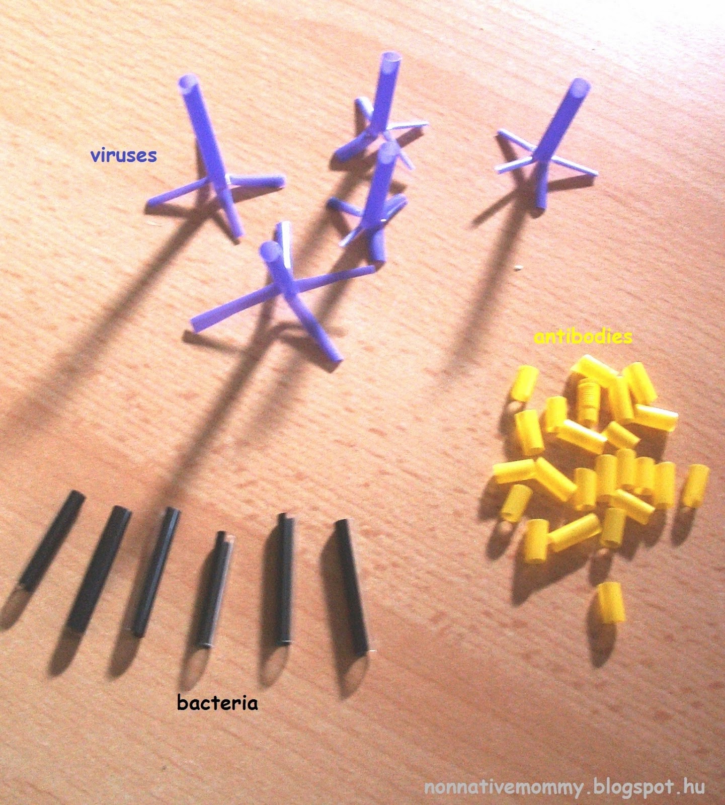 Viruses and bacteria (purple and black straw pieces) are tiny germs attacking your body and making you ill.