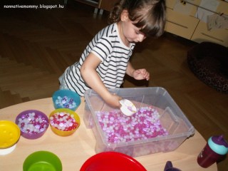 E.’s new focus is on the human body, more precisely on BLOOD. She loves talking about it, seeing it, reading about it and experiencing it. That’s why the sensory bin idea has come up.
